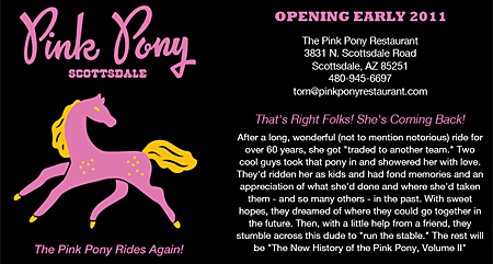 Here’s some potentially great news: The Pink Pony, the 61-year-old landmark in Old Town Scottsdale that closed in 2009, apparently is reopening. A mysterious post on the legendary sports bar and restaurant’s new website (pictured) says: