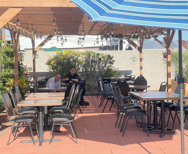 The food truck, which serves about 80 percent of the restaurant’s menu, offers sit-down service on a covered patio with misters.