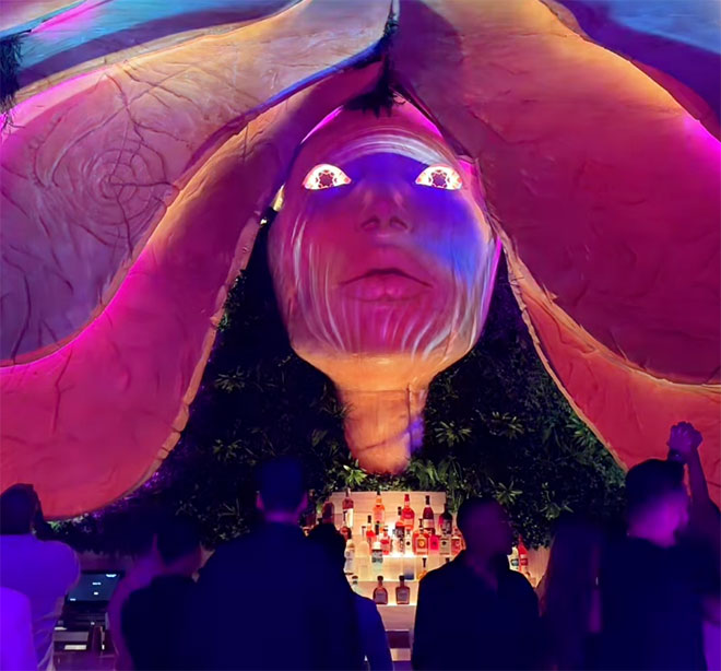 The European-inspired remodel of the 15,000-square-foot building includes a 100-foot sculpted wooden goddess (pictured) rising behind the main bar. In the front lounge, a sculptural tree has LED-adorned branches.