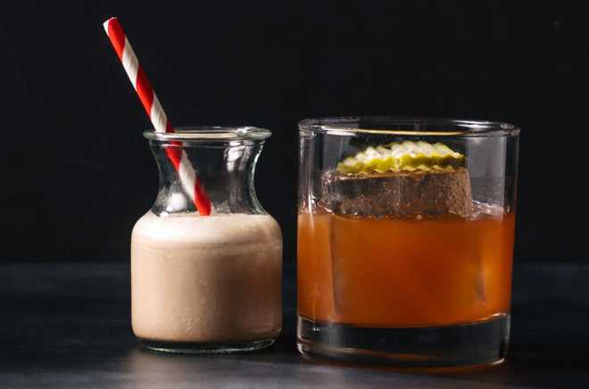 The drink ($15) is made with Jim Beam bourbon, Corazon añejo tequila, celery bitters, brioche, and a dill pickle chip. It’s accompanied by a boozy mini malt