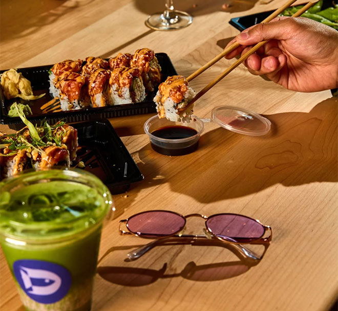 The fast-casual venue functions as a matcha and coffee bar in the morning and a sushi and craft cocktail restaurant the rest of the day.