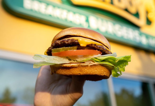 The chain’s signature Farmer’s Burger features two beef patties topped with cheese, smoked bacon, hand-smashed avocado, veggies, and Thousand Island dressing on a sesame seed bun.