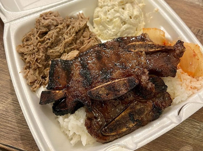 The menu features the same popular plates of palua pork, garlic chicken, and kalbi ribs accompanied by rice and macaroni salad.