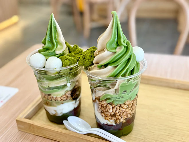 In addition to matcha drinks, the menu offers a variety of other matcha-infused items, such as soft-serve ice cream, roll cake, waffles, and pudding.