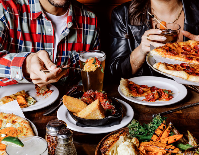 The menu offers wood-fired traditional and Detroit-style deep dish pizzas, house-made pastas, salads, and more.