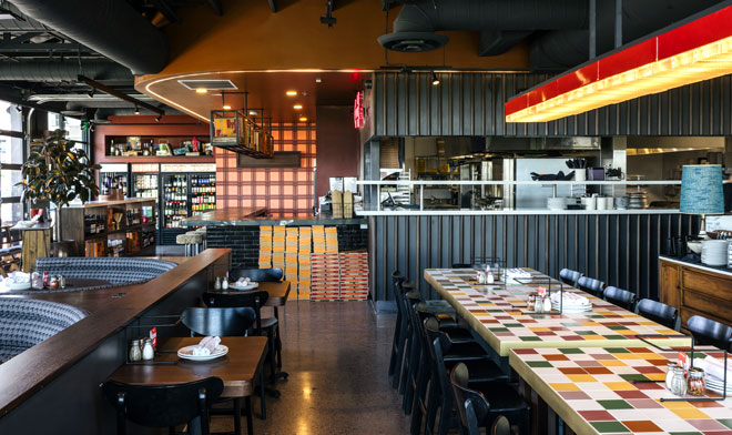 Like the original, the 4,000-square-foot PV location has low-slung bricks, custom tilework, and vibrant 1970s graphics and wallpaper. A 1,500-square-foot curved patio hugs half the building.