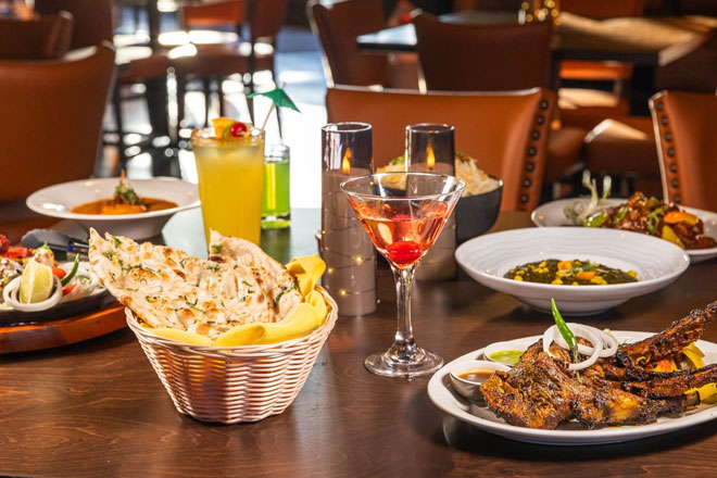 Menu highlights include chicken malai kebobs, samosas with mint and tamarind chutney, and Kandhari lamb chops with chef’s special sauce.
