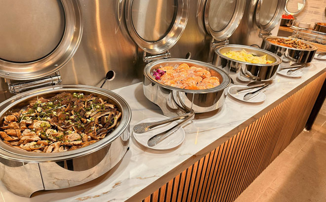 A buffet bar, included with plates but also available by itself, offers corn chowder, garlic bread, dumplings, chicken wings, shrimp, clams, and more.