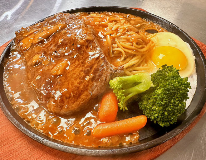 Steaks – filet mignon, sirloin, T-bone, ribeye, etc. – are served on sizzling plates with a large helping of noodles, and egg, and vegetable. You also can order plates of chicken, pork, or seafood.