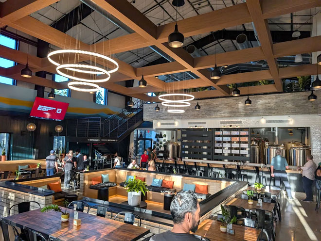 The 10,000-square-foot, two-story brewery’s stunning interior features a sunken seating area beneath hovering circular lights, an airy upstairs bar, a full kitchen, and a patio filled with picnic tables and Adirondack chairs around fire pits.
