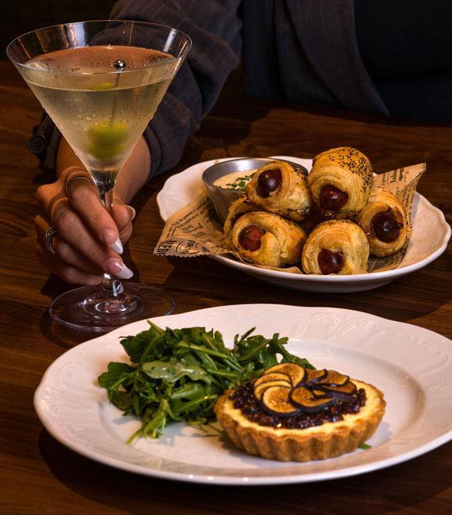 (Pictured: wagyu pigs on a blanket with mustard seed sauce, $19, and fresh fig tartlet with aged goat cheese, arugula, and butter poached almond, $17.)