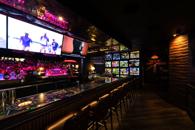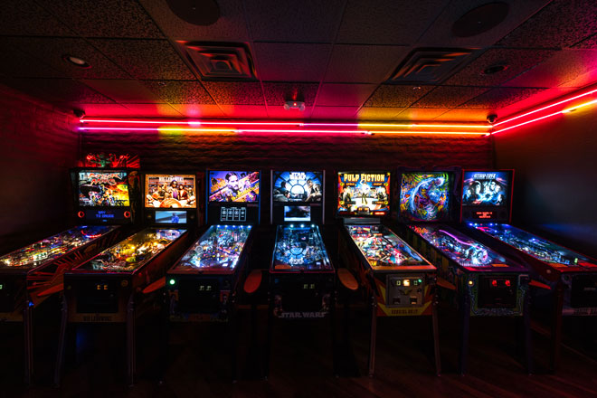 The space has been completely reimagined with a central bar crowned by a glowing countertop crafted from vintage pinball playfields. The 5,500-square-foot layout lets guests choose their own adventure: a dedicated dining room, an arcade packed with pinball and classic games, or a fireplace-lined garden patio.