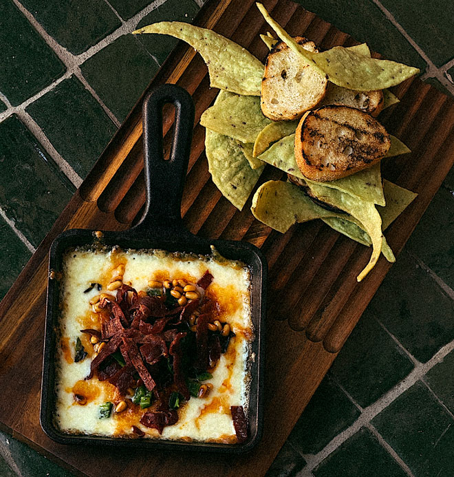 Highlights include ahi tostadas with chipotle aioli, dirty martini dip with parmesan lavash, shrimp aguachile punched up with Calabrian chile, birria grilled cheese with consomé, campanelle alla vodka capped with burrata, and a Mediterranean platter stacked with skewers, hummus and tzatziki.