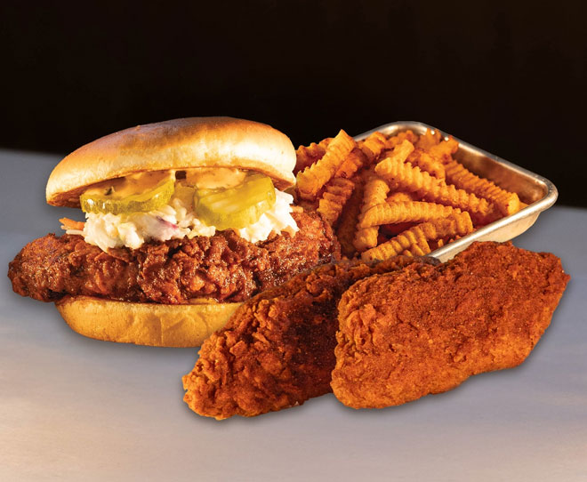 The menu sticks to the greatest hits of the hot-chicken wave: oversized chicken sandwiches piled high on toasted buns with slaw and pickles; crispy tenders served with Texas toast; and heat levels that typically range from no-spice to extra-hot for thrill-seekers.
