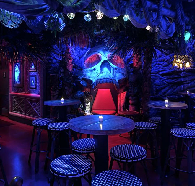 Tropic Thunder’s dark decor – courtesy of architect Wesley James, who collaborated on Wright’s Devil’s Hideaway and Idle Hands in downtown Tempe – features a skull-shaped throne, murals of tigers and pin-up girls, classic lantern lighting, and zebra print barstools.