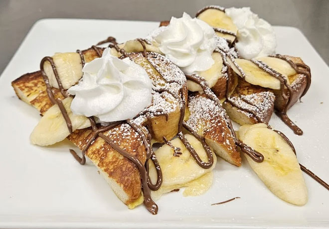 The menu focuses on well-executed staples rather than trend chasing. Highlights include Nutella and banana French toast, biscuits and gravy, a grilled cheese sandwich, and chicken salad on toast.