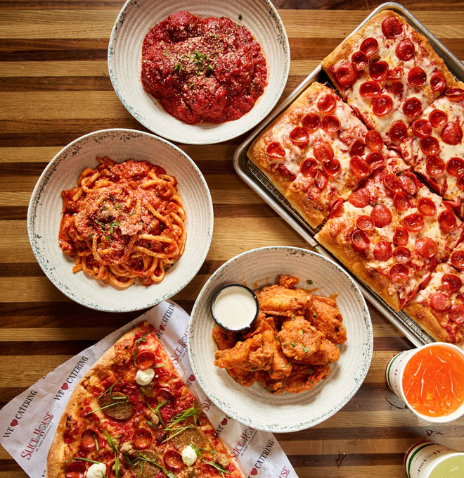 The menu showcases the style-spanning approach that’s made Slice House a national hit, with New York, Sicilian, Grandma, and Detroit-style pies available by the slice or whole. Expect gluten-free, vegan, and vegetarian options alongside wings, salads, and fresh pastas, plus a beverage lineup featuring local craft beer and wine.
